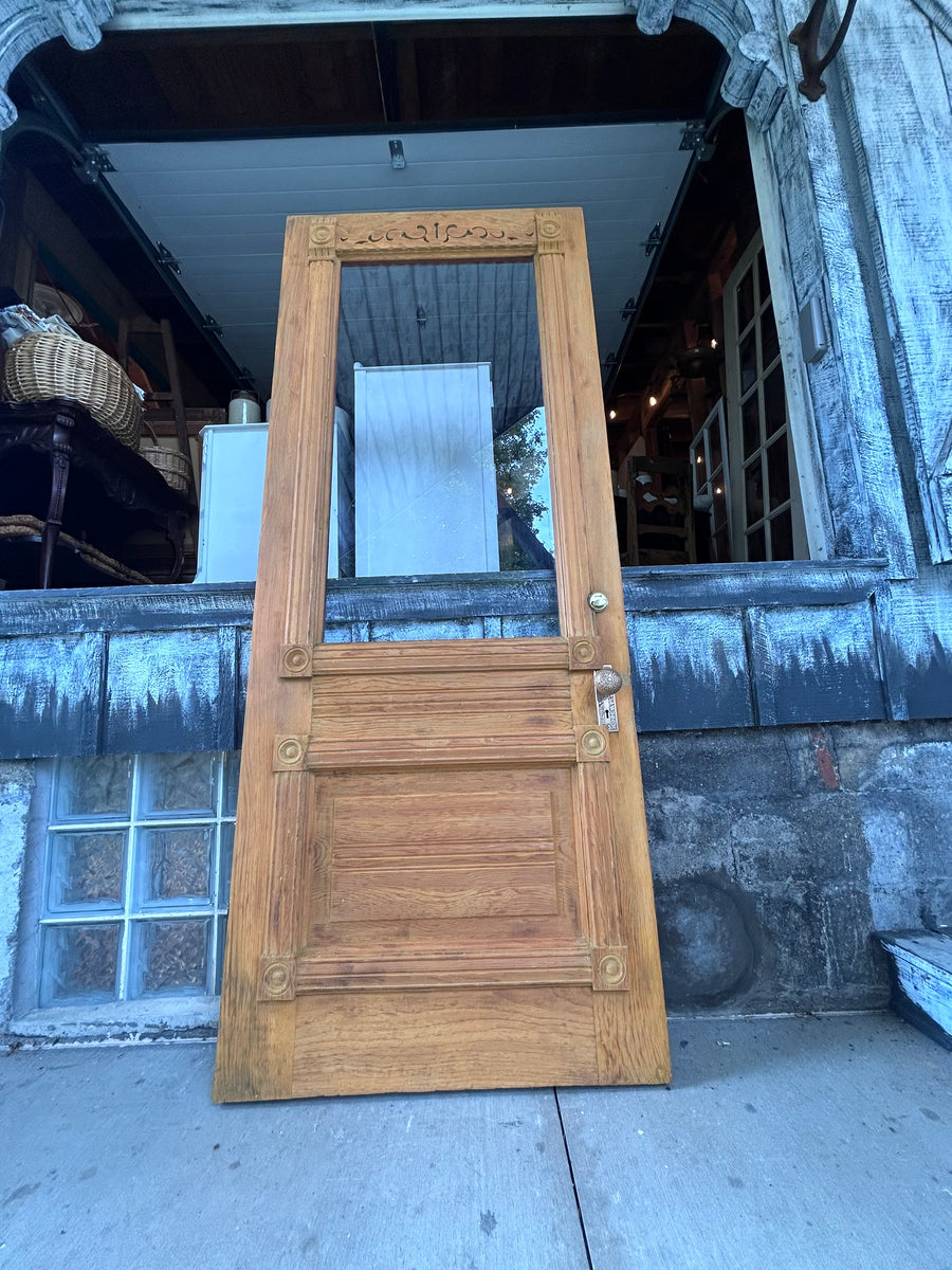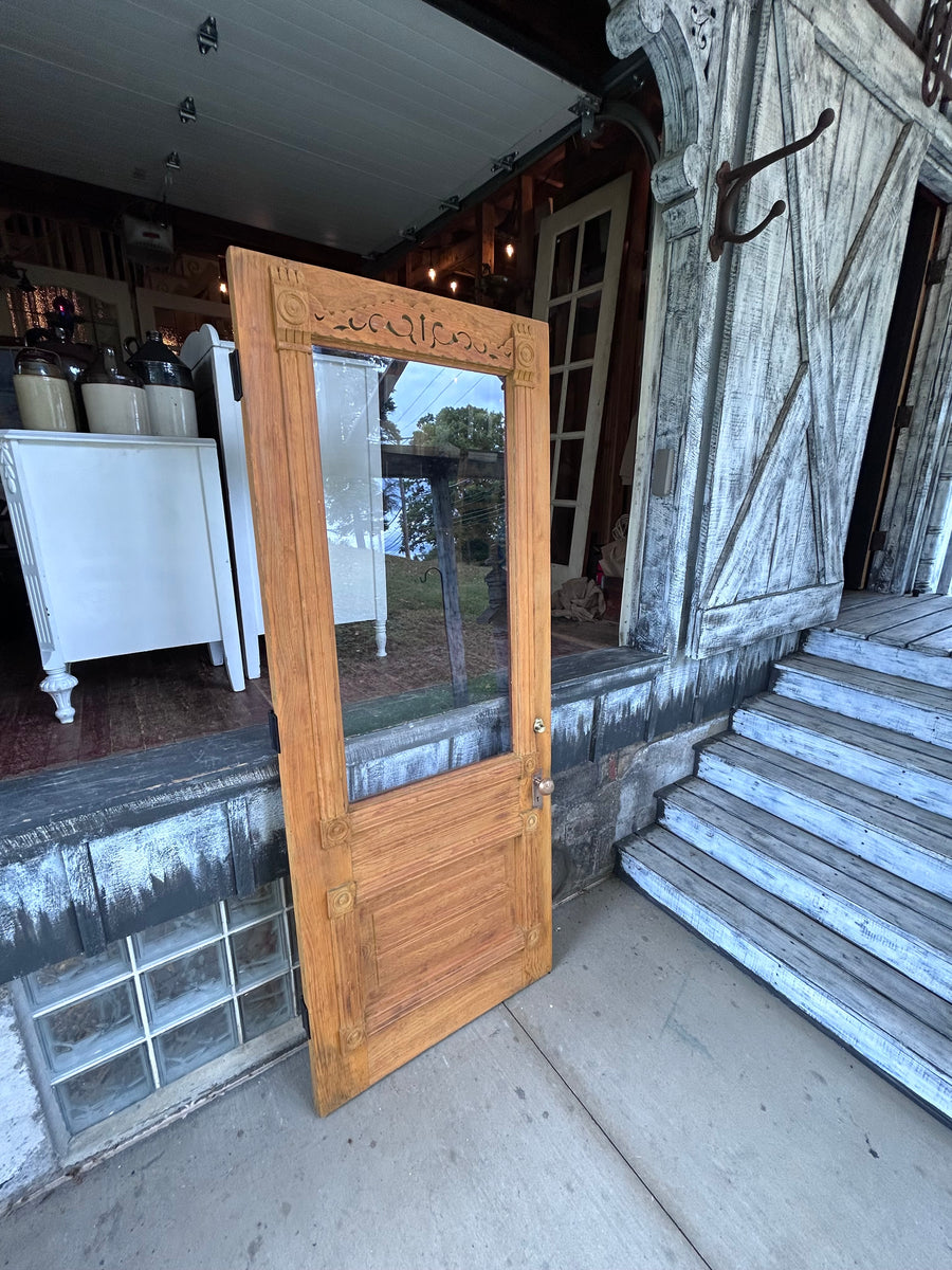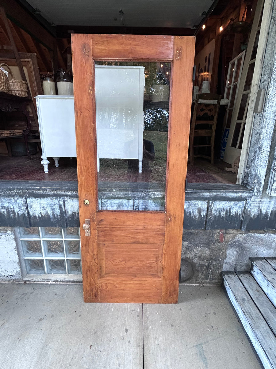Beautiful 32 inch antique door with 3/4 glass view. Door has plexiglass. Actual measurements are 31 1/2 inches wide and 79 1/4 inches tall and 1 3/4 inches thick.