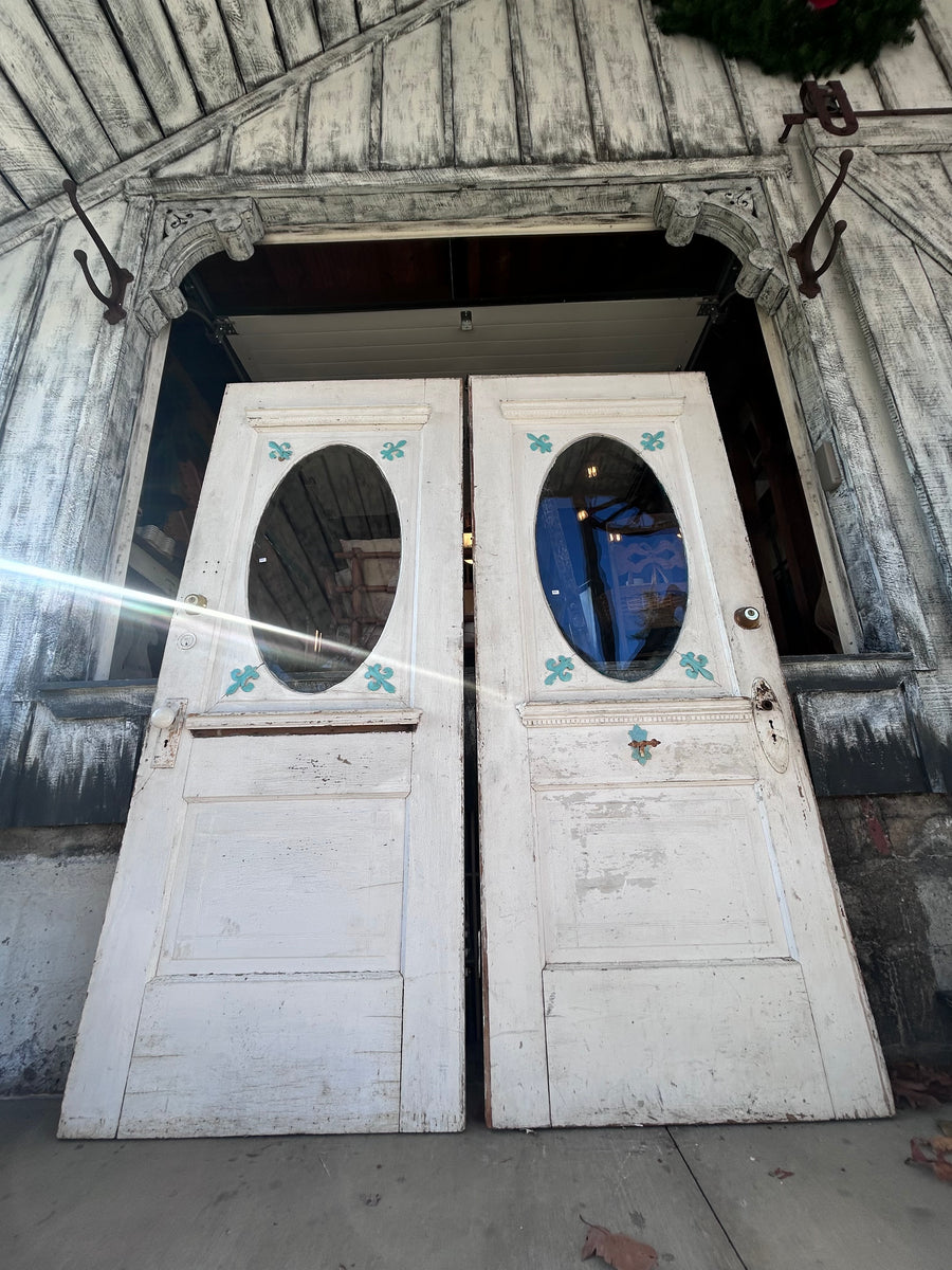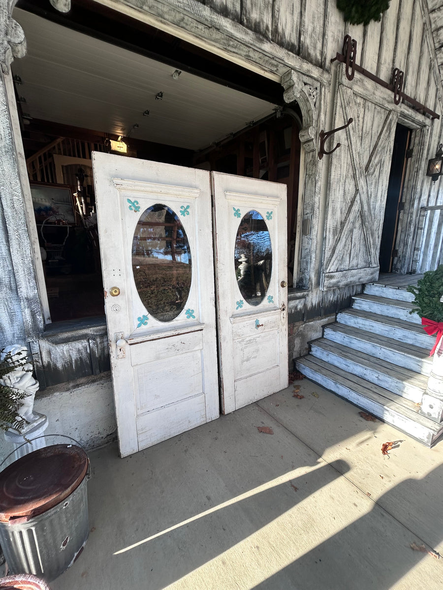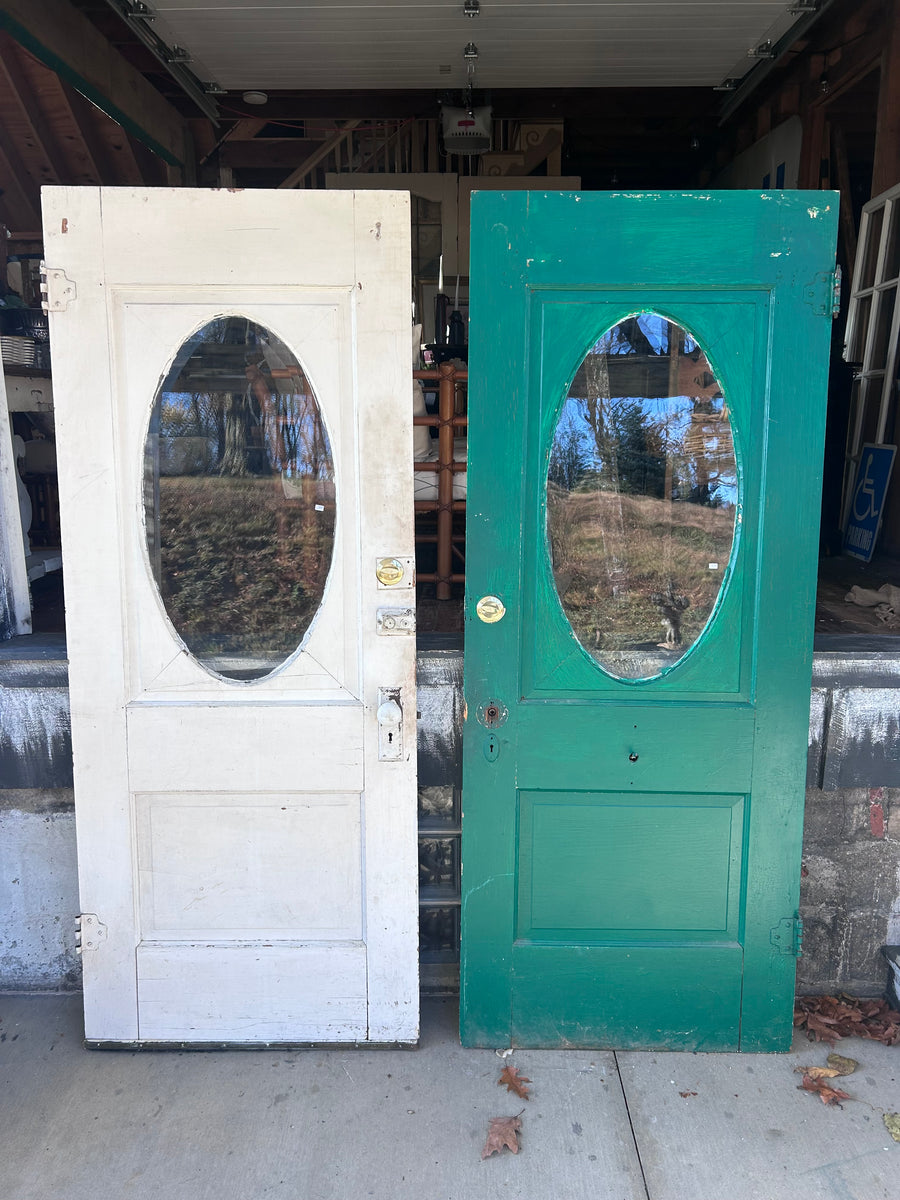 32” antique oval glass entry doors. Price listed is per door. The door on the left has a beveled glass window and it measures 32 inches wide, 80 inches tall, and 1 3/8 thick. The door on the right has it original wavy glass and measures 32 inches wide, 80 inches tall, and 1 3/8 thick.