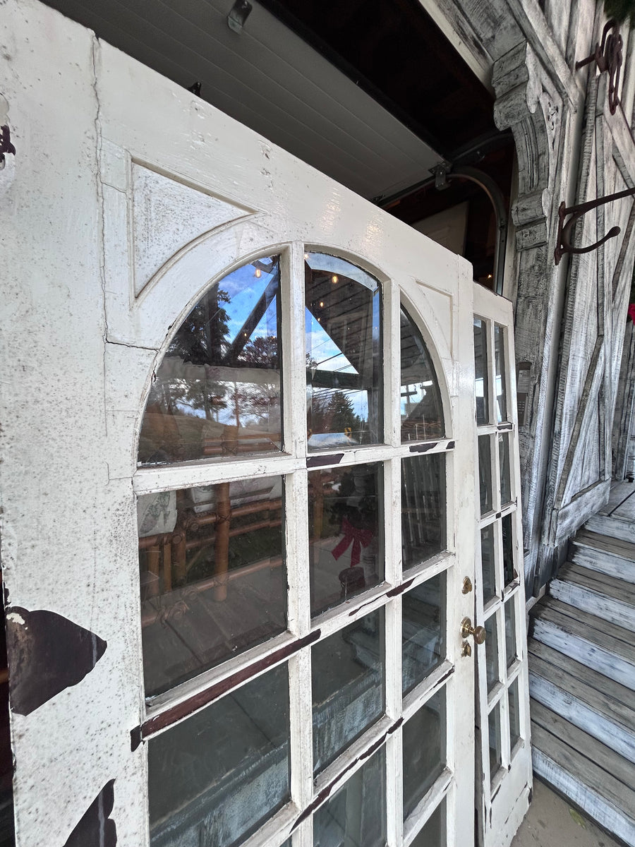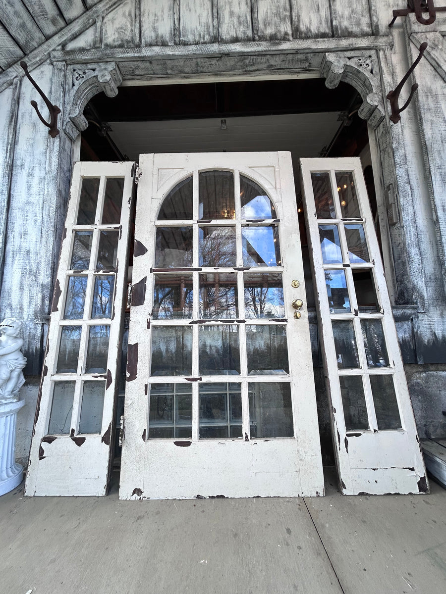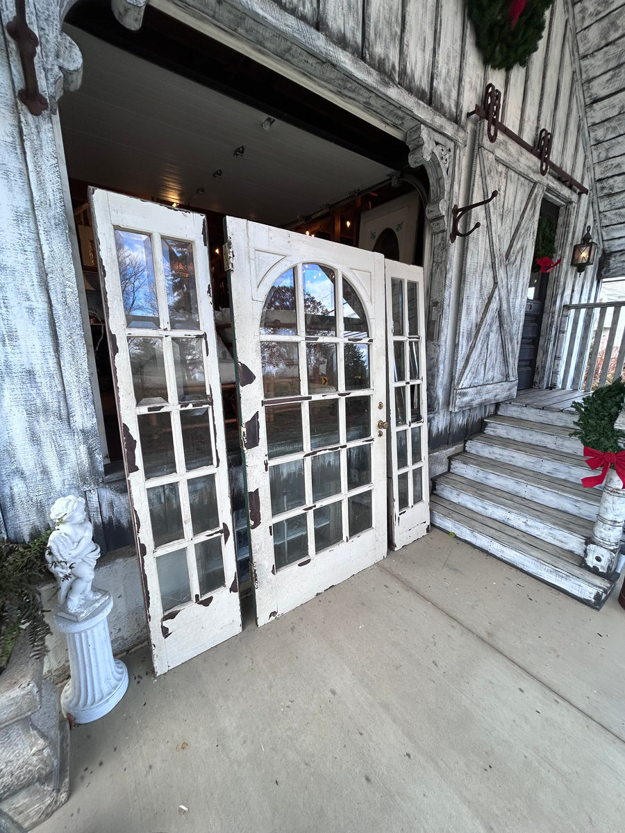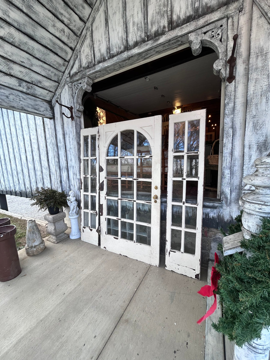 The door measures 42 inches wide, 82 3/4 inches tall, and 1 3/5 inches thick. The side lights are the same height and thickness and are 17 3/4 inches wide. The door inside lights both have beveled glass. Each side light has a broken piece of glass. All of the glass in the door is intact. If you need help with replacing the glass, we can help you with that as well.
