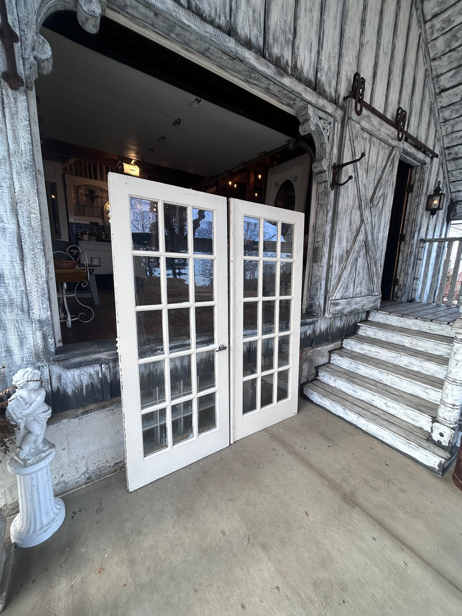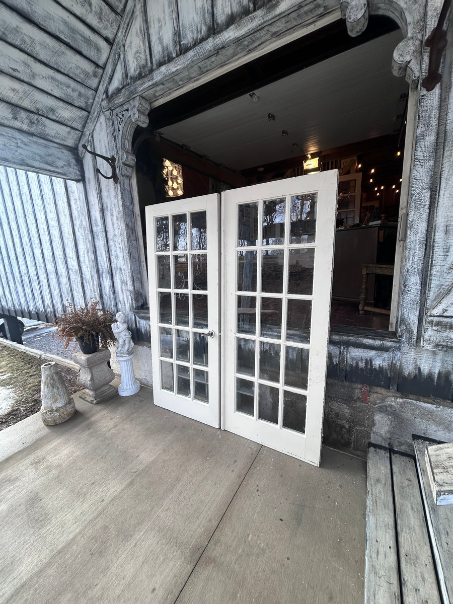 Beautiful pair of antique French doors featuring their original wavy glass panes. These doors have incredible character and charm, with the subtle distortions in the old glass that you simply cannot replicate with modern materials. Each door is divided into 15 lites, allowing for maximum natural light while maintaining classic architectural detail. The proportions are generous at 32” wide per door, making them ideal for a grand interior opening between living spaces, a dining room, office, sunroom, or even as an exterior set under cover. The original wavy glass gives them that authentic historic look and soft reflection that adds warmth and depth to any space.