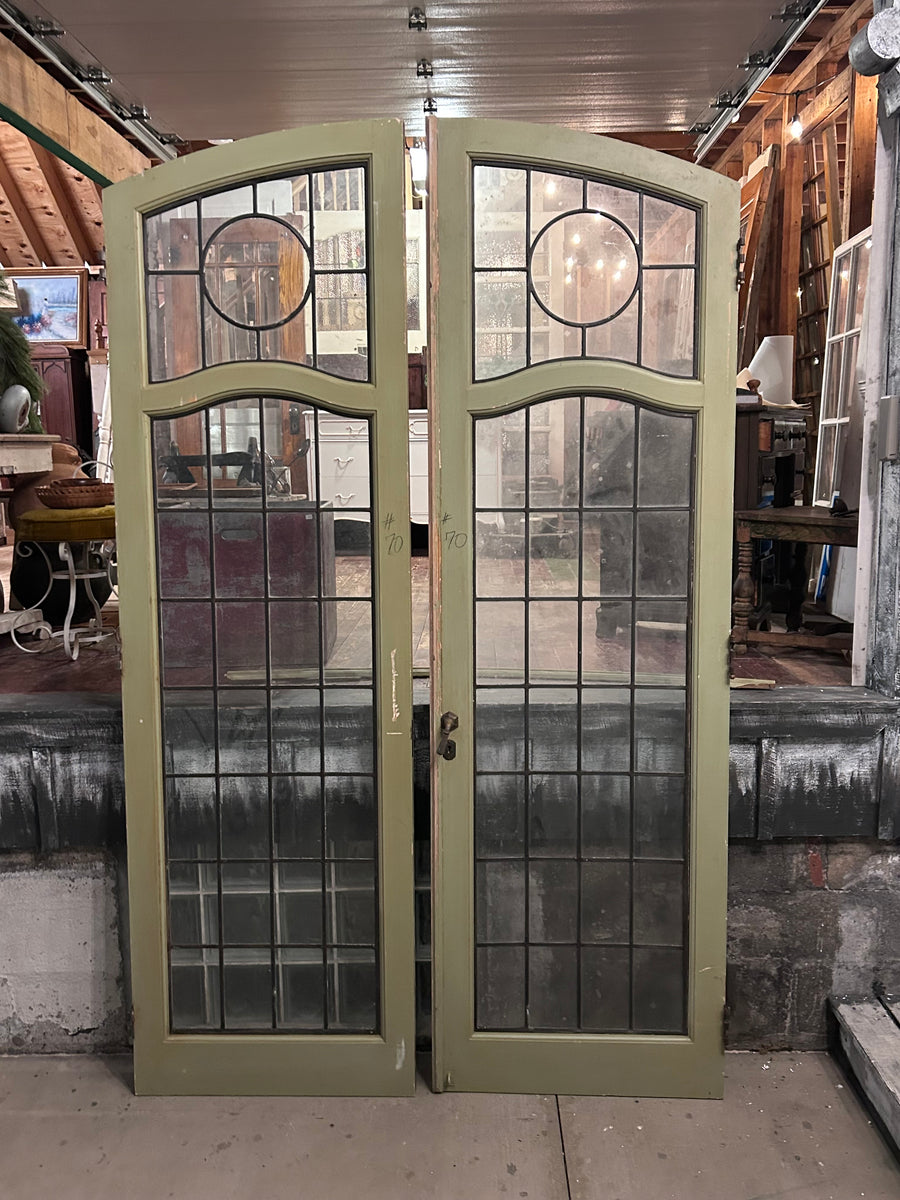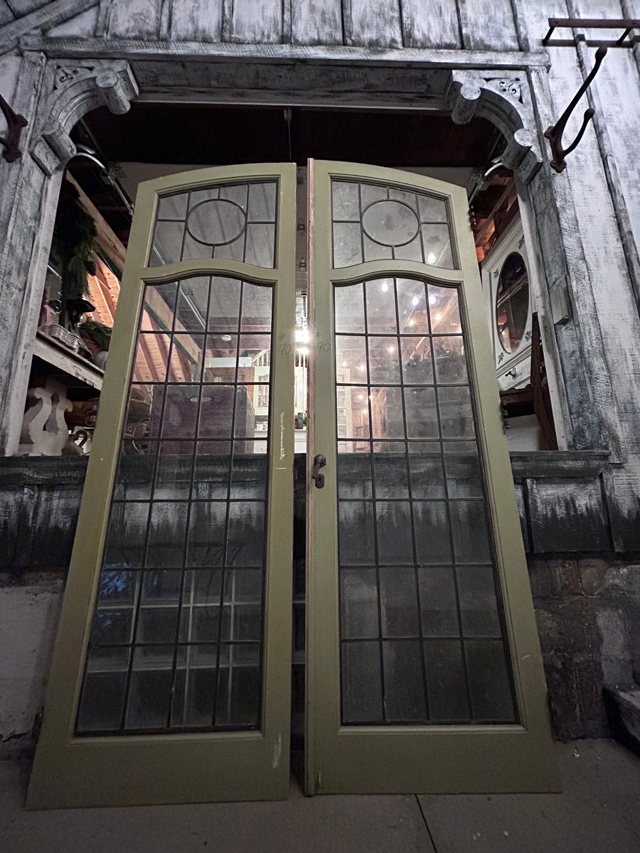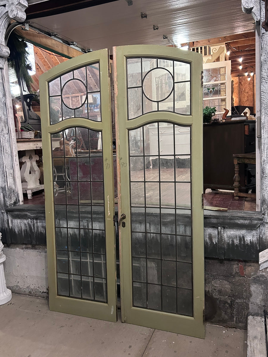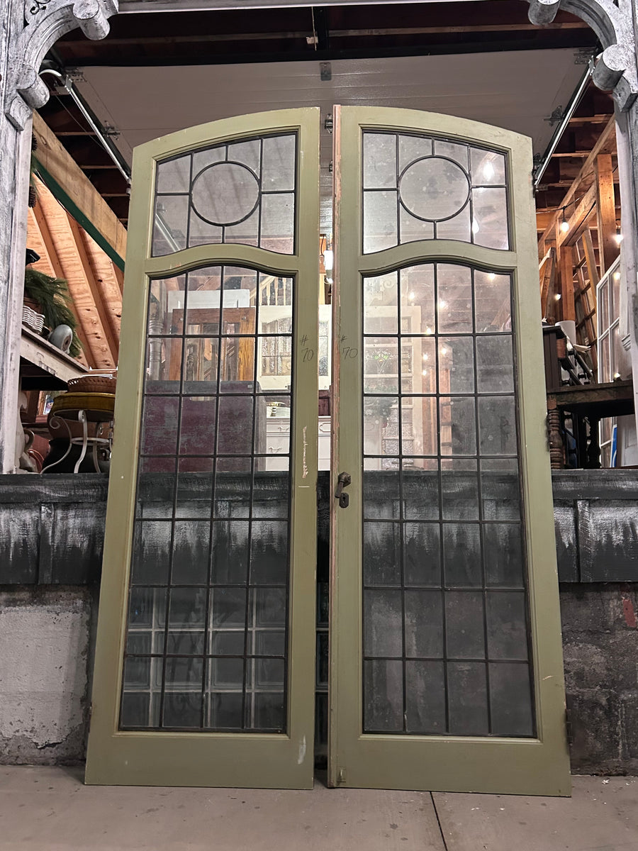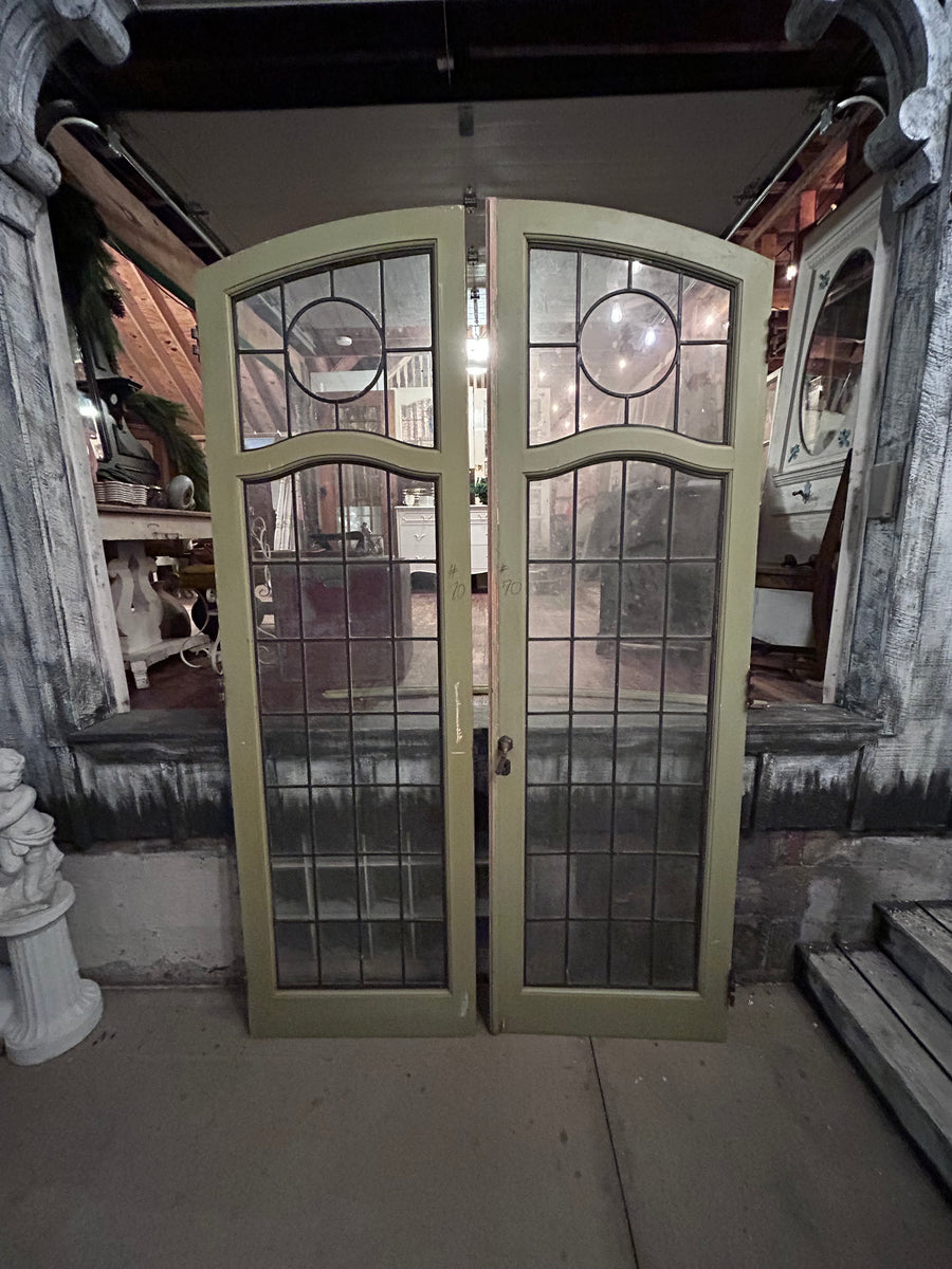 Stunning matched pair of vintage solid wood French doors featuring arched tops, decorative leaded glass, and true divided-light panels. Together the doors are 56 inches wide, 92 3/4 inches tall at the highest point of the arch, 86 3/4 inches tall at the shorter part of the arch, 1 3/4 inches thick. These doors likely date to the 1920s–30s and reflect classic Tudor/Mediterranean revival craftsmanship — full of character you won’t find in modern reproductions.