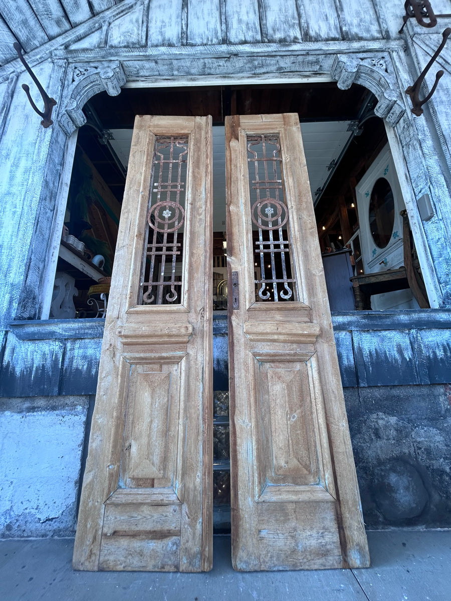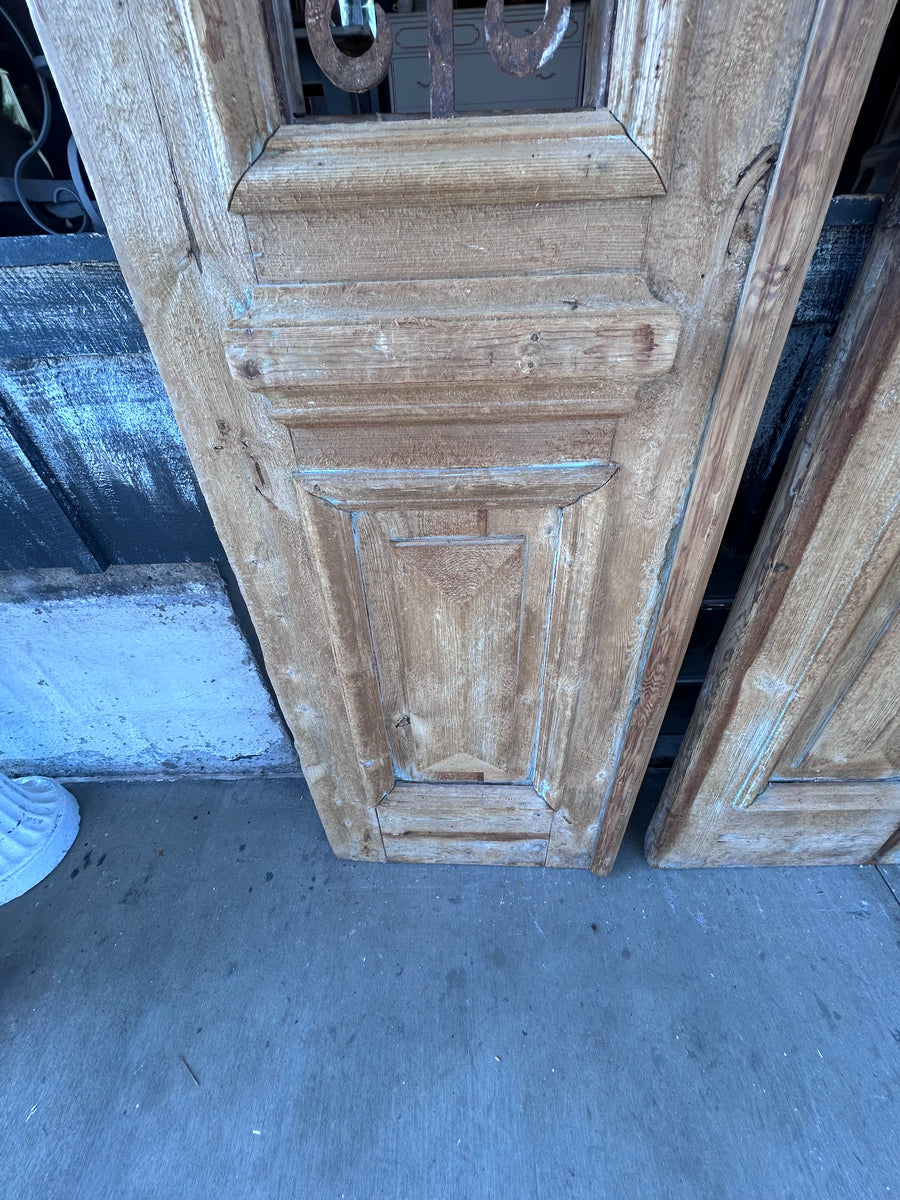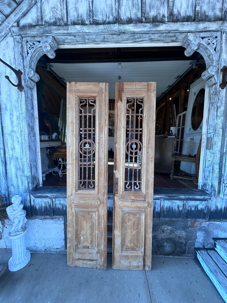 Beautiful pair of tall antique solid wood doors featuring decorative wrought iron grille inserts. These doors have incredible architectural presence with their narrow proportions and impressive 94 1/4” height — perfect for a historic home, restoration project, wine cellar, pantry, library, or statement entry. The upper panels showcase intricate ironwork with circular and scroll detailing, giving them an old-world European feel. The lower panels are solid wood with natural grain and age character throughout. On the backside of each door is an operable window panel (glass is currently missing), allowing for restoration flexibility. Replace the glass for functionality or customize with clear, frosted, or seeded glass to match your project.