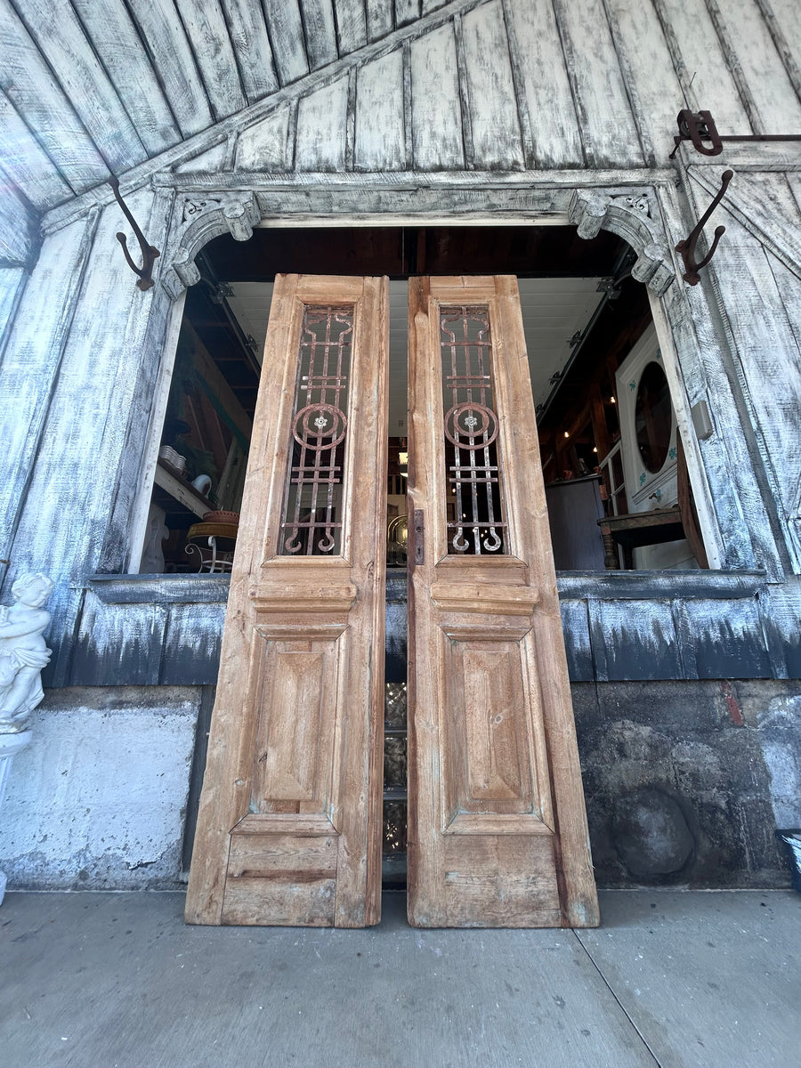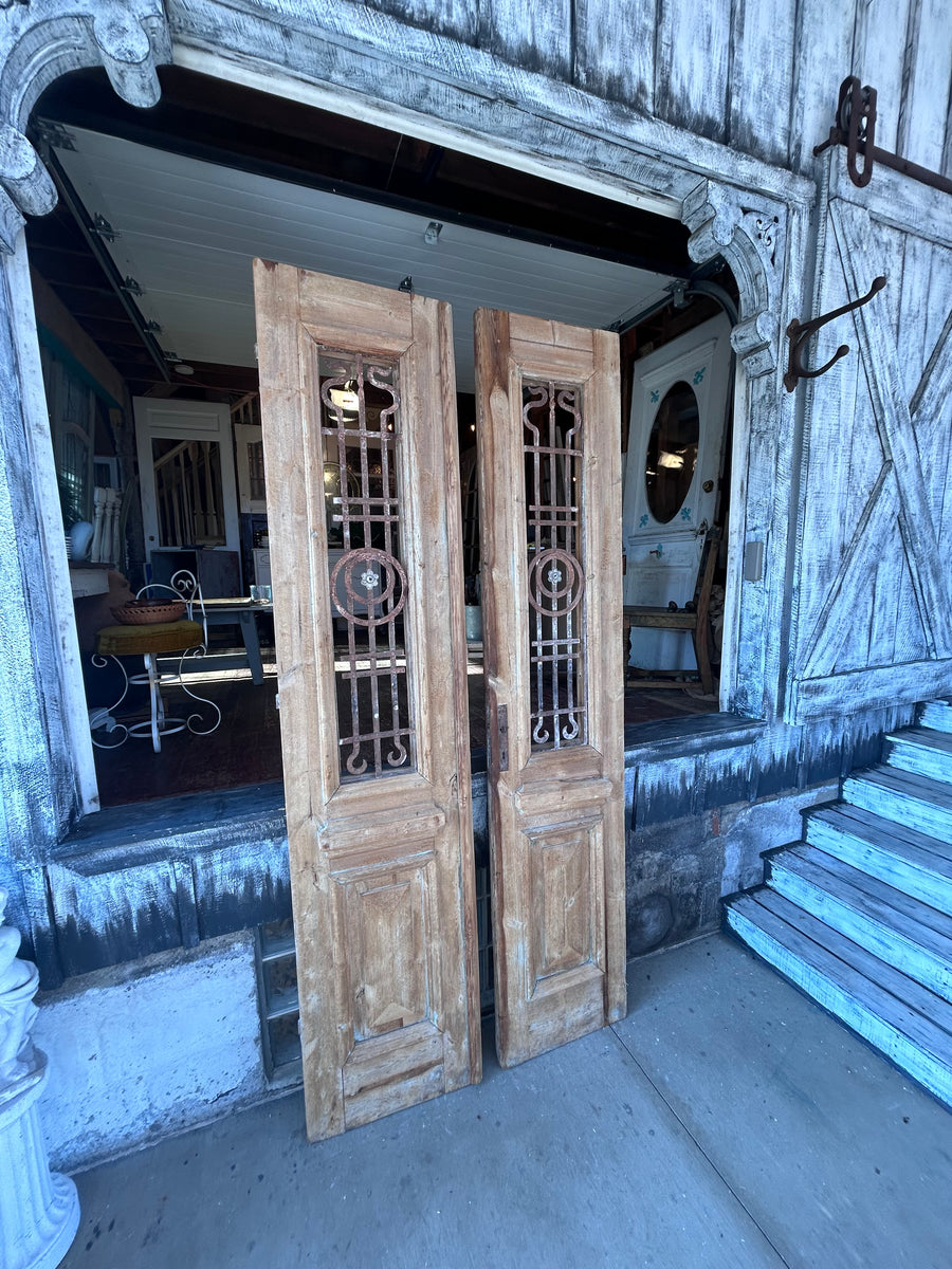 Antique Solid Wood Double Doors with Wrought Iron Grilles