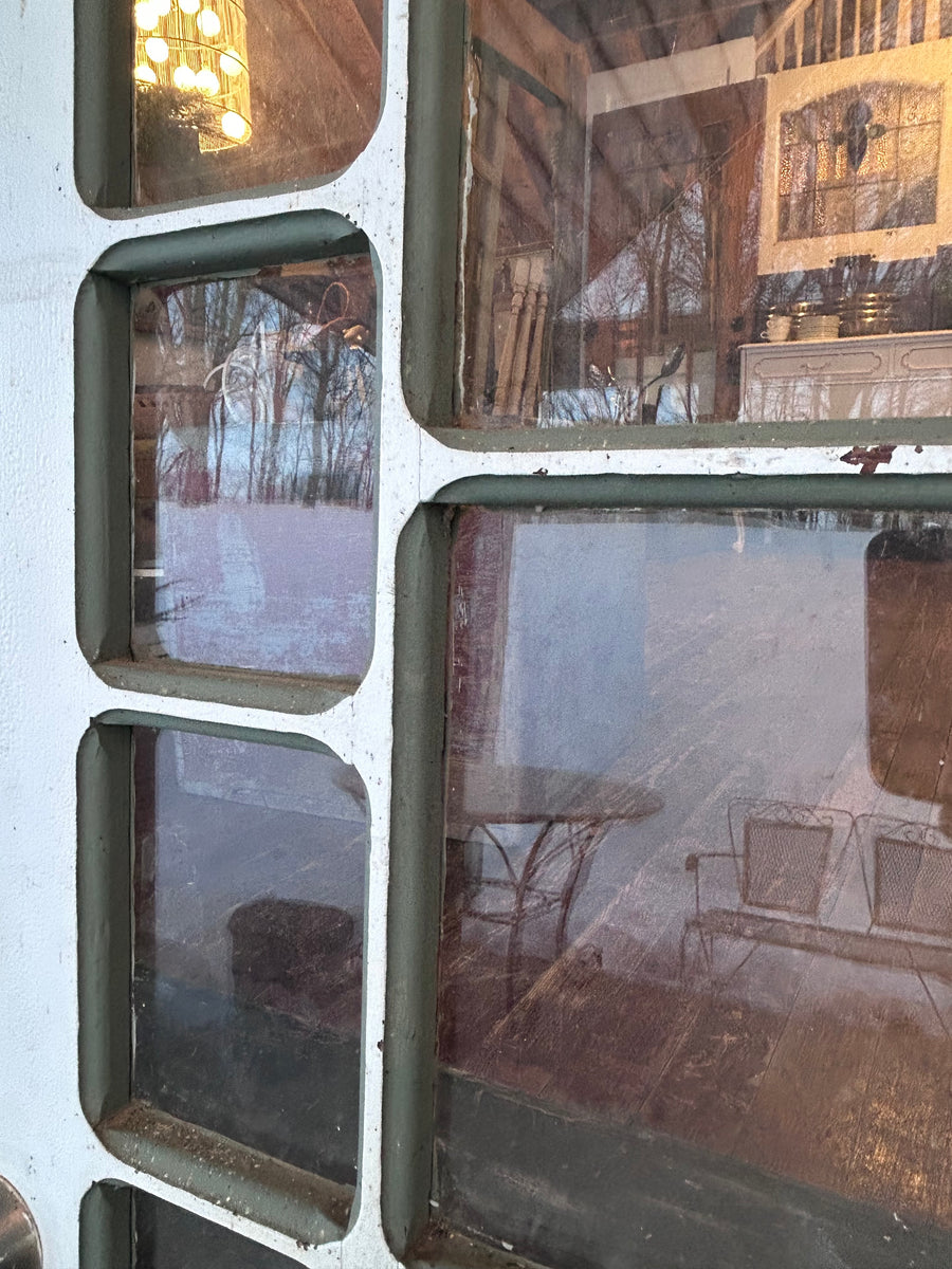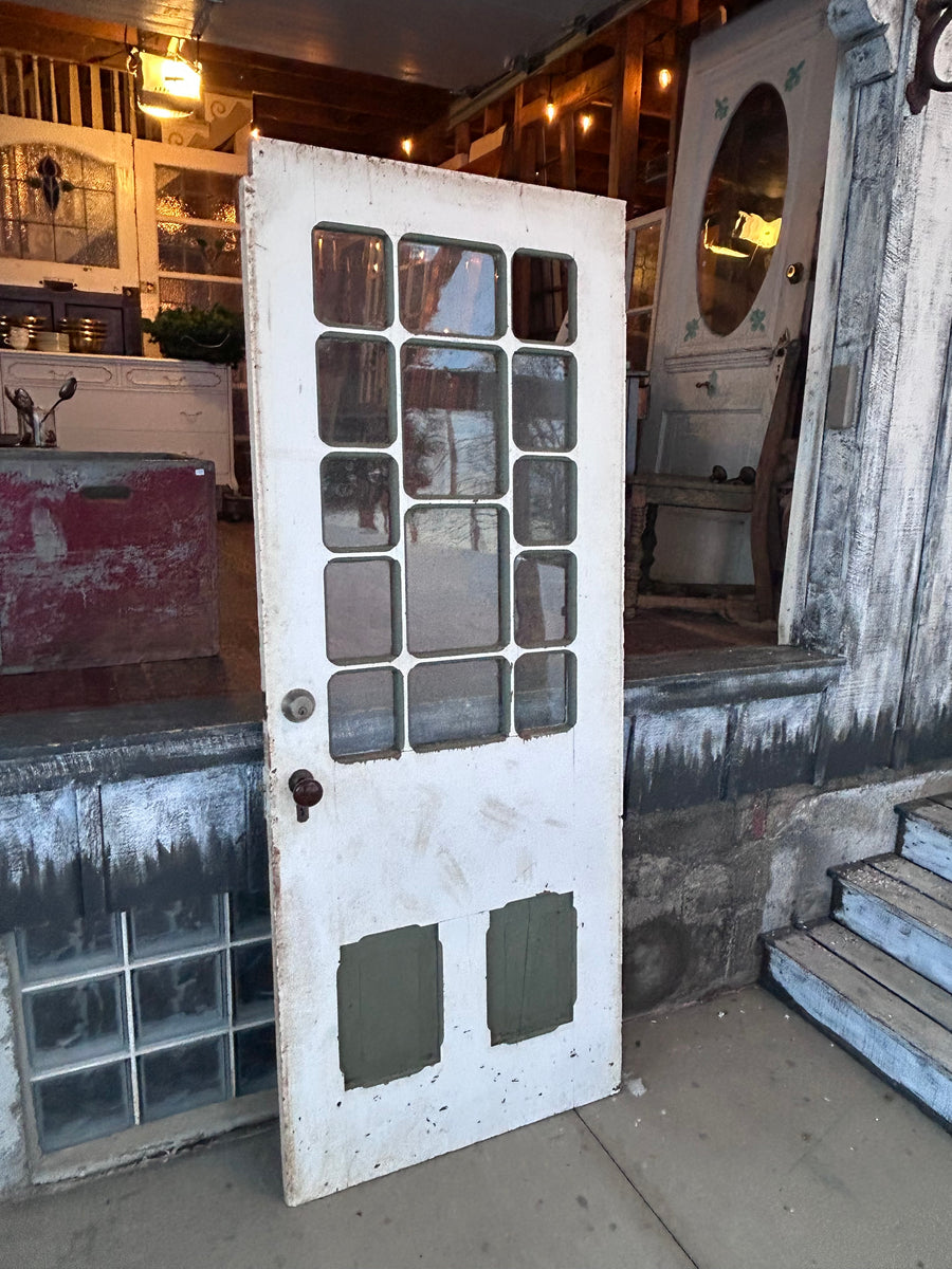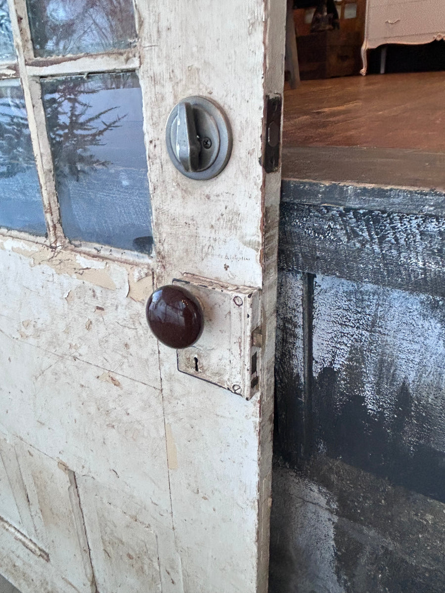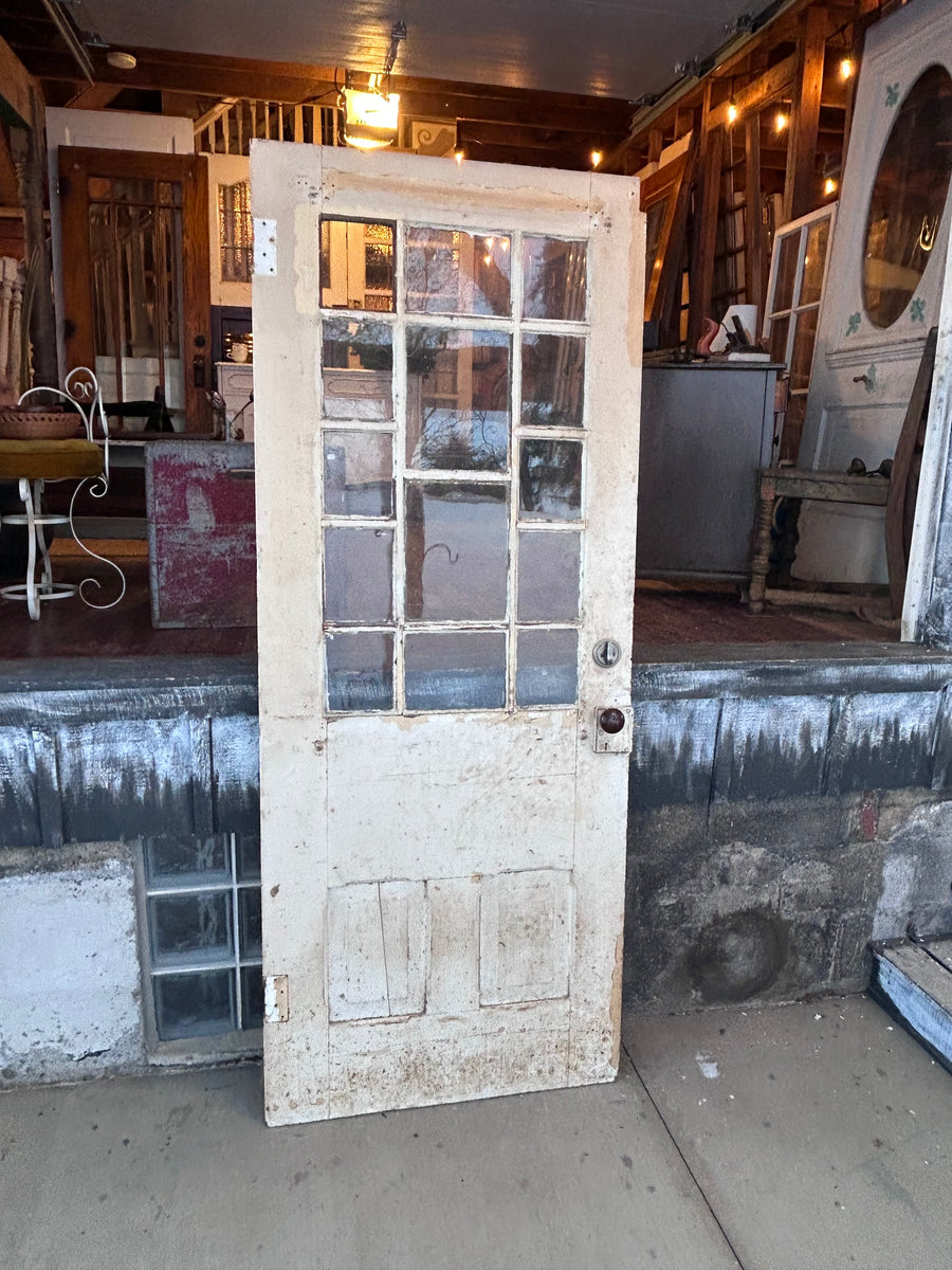 Beautiful 32” Antique Farmhouse Door. This door measures 31 3/4 inches wide, 79 3/8 inches tall, and 1 1/4 inches thick. This salvaged door features a unique geometric window with its original wavy glass that lets in beautiful light while still offering privacy. Solid wood construction with original hardware and authentic aged patina. There is a small notch out of the door in the top left corner that can easily be patched in with a piece of wood. There is also a piece of glass in the top right side of the door that is missing and can be easily replaced.