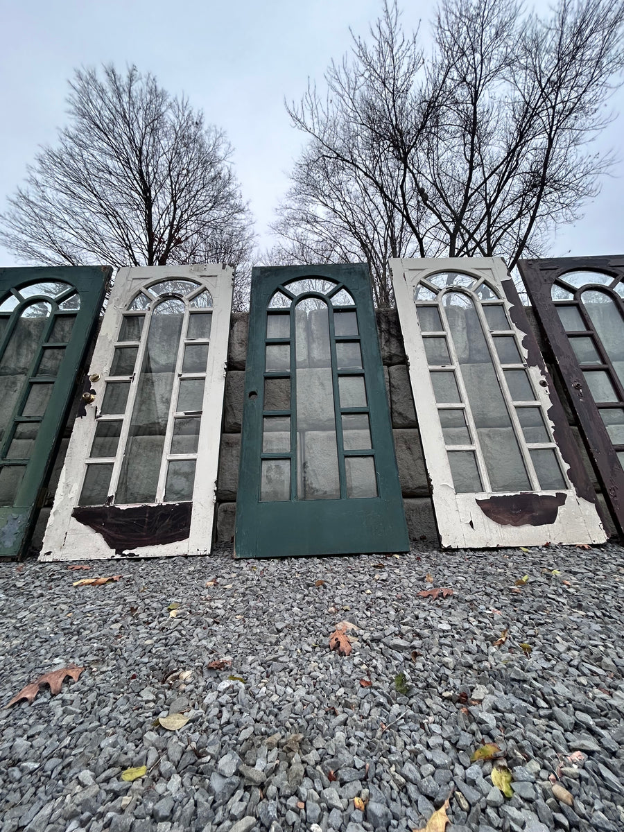 These antique art deco doors came from a 1920s home in Spartanburg South Carolina. They were all exterior doors on the home. The doors measure 36 inches wide, 83 inches tall, and 1 3/4 inches thick. Some of them have been trimmed to fit their opening, meaning they would be 35 3/4” wide or 35 1/2 inches wide. They all have 1/4” thick beveled glass.