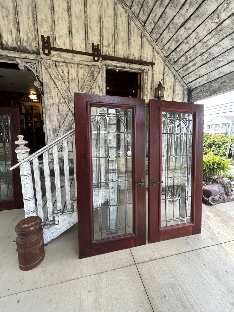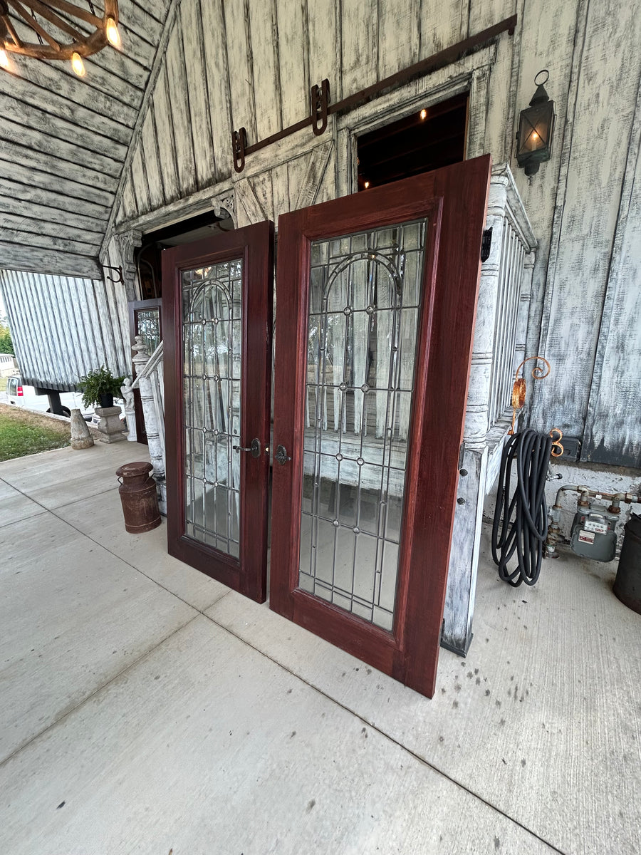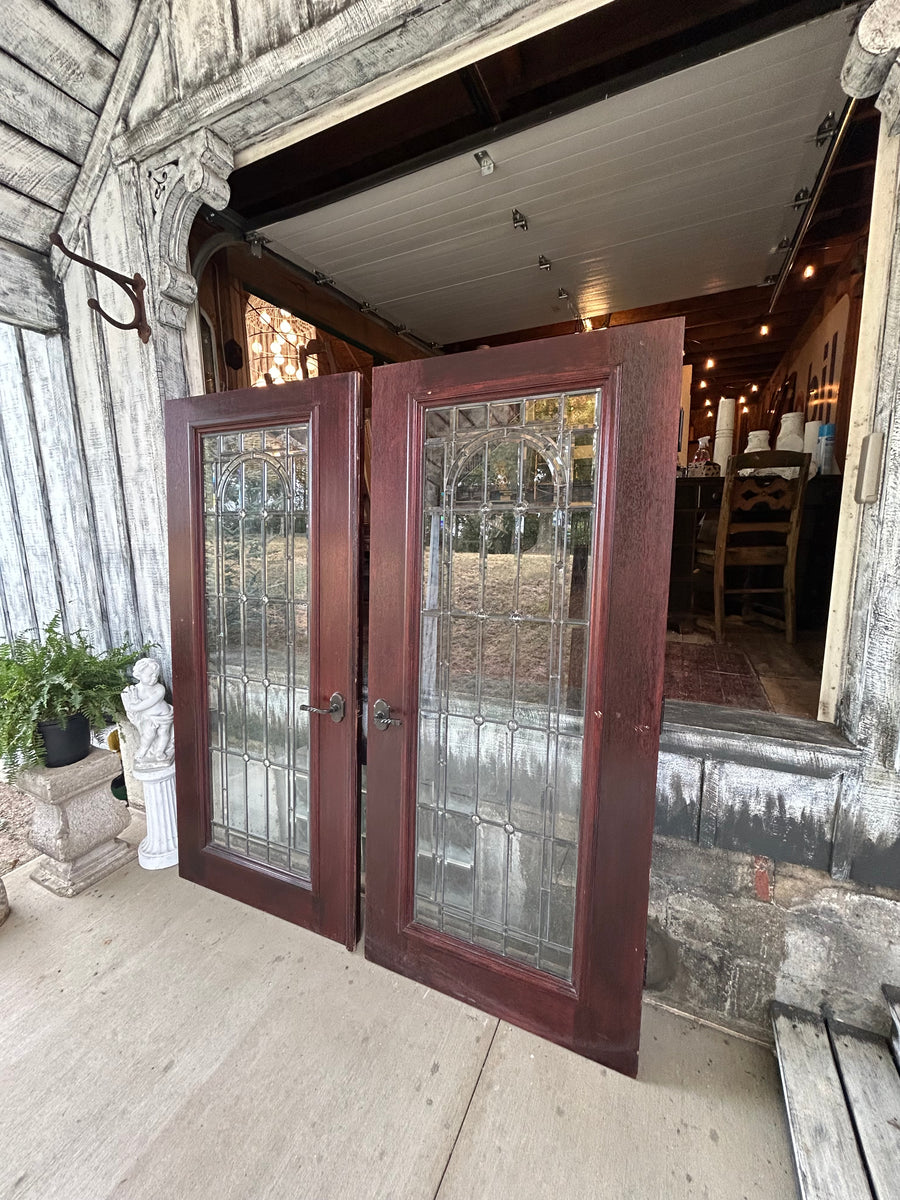 Beautiful solid wood mahogany doors with full view, leaded beveled glass windows.
