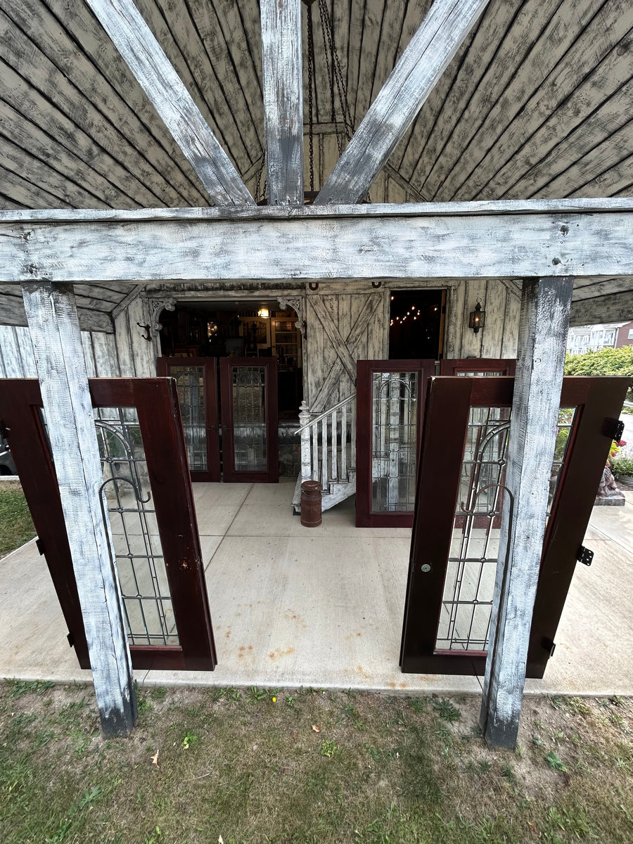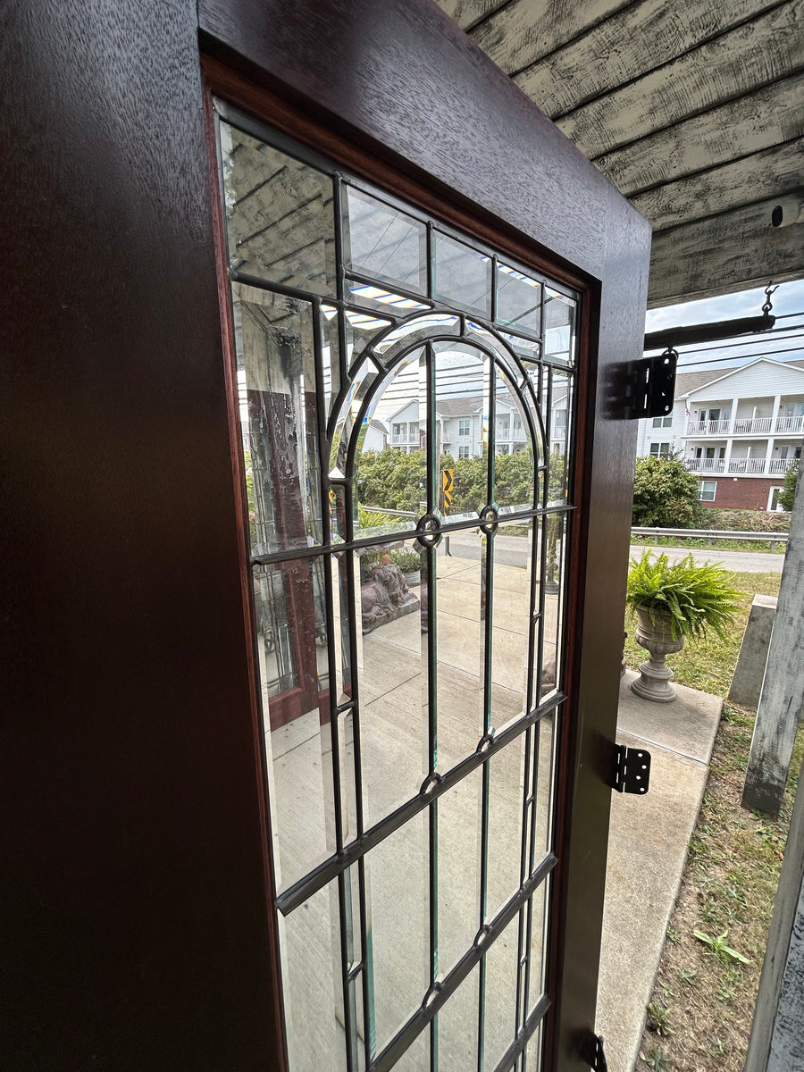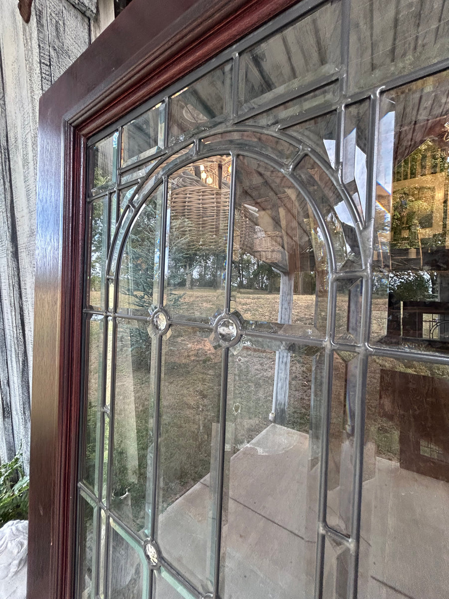 Beautiful solid wood mahogany doors with full view, leaded beveled glass windows.